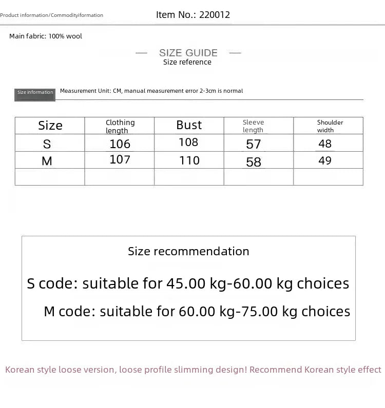 Manteau en alpaga haut de gamme, mi-long et double face, au style coréen élégant. Chaud, confortable et polyvalent, parfait pour l’automne et l’hiver. Design raffiné qui s’adapte à toutes vos tenues pour un look chic et moderne.